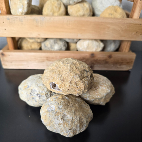 Van buiten lijkt het een gewone steen, maar vanbinnen schuilt een schitterend geheim. In iedere bol vind je bergkristallen, soms groot en robuust, soms fijn en sprankelend. Elke geode is uniek en de inhoud blijft een verrassing tot jij hem openmaakt.